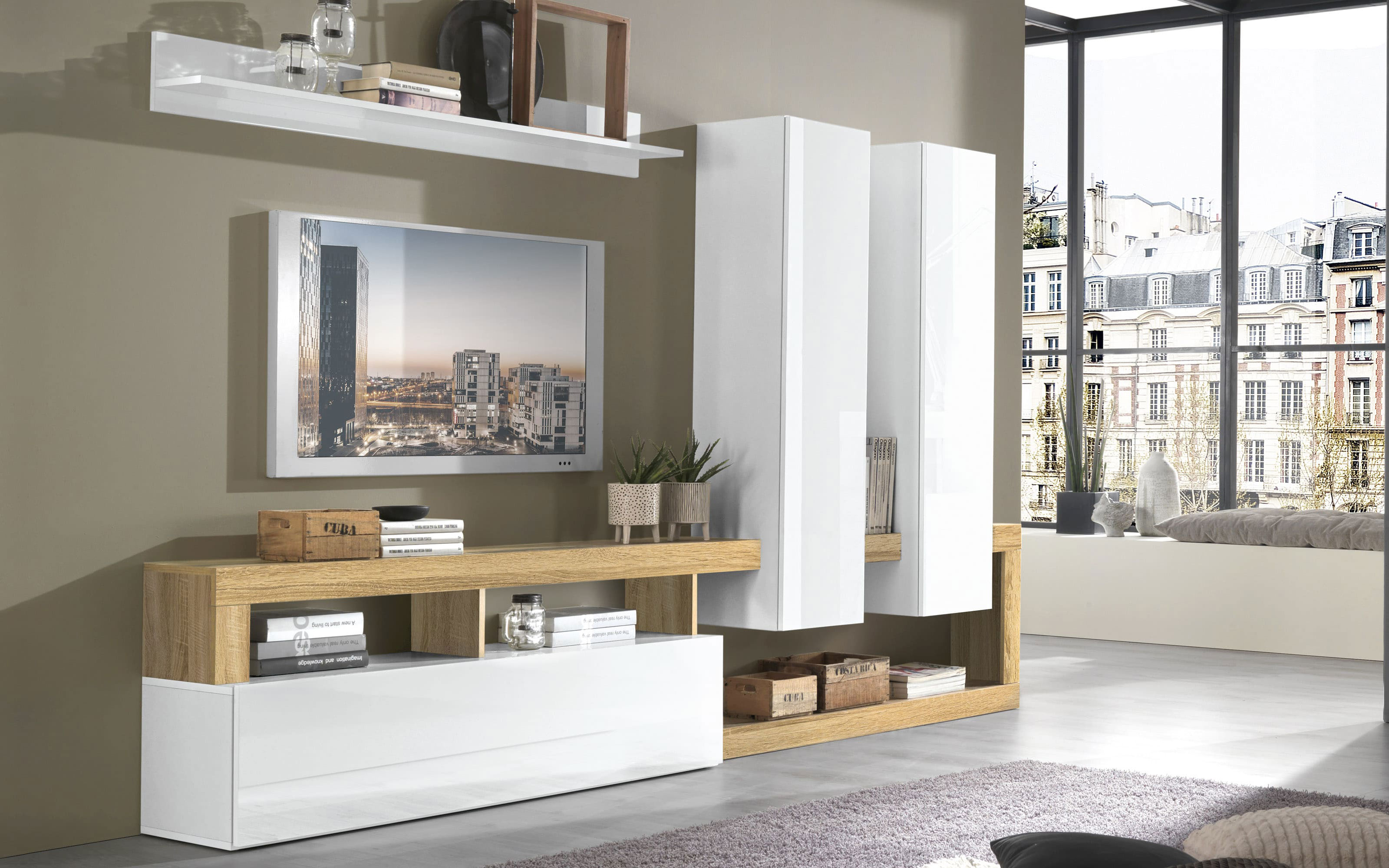 Scopri Amburgo: Soggiorno bianco lucido, effetto rovere cadiz. Scegli risparmio e sicurezza garantiti da Mondo Convenienza