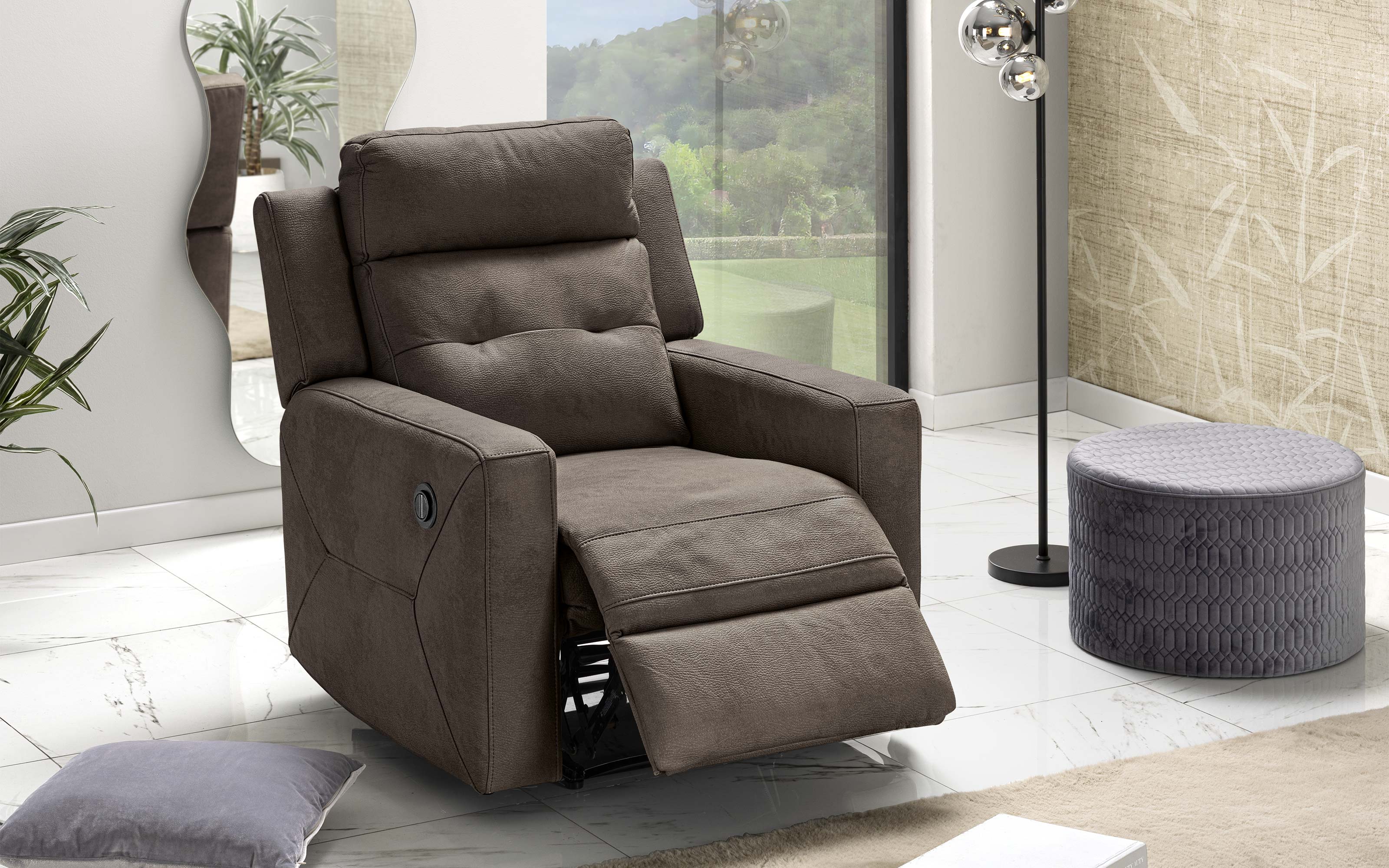 Scopri la comodità di questa poltrona con recliner elettrico. Soffici braccioli, schienale imbottito e rinforzato e una pediera estraibile manualmente.