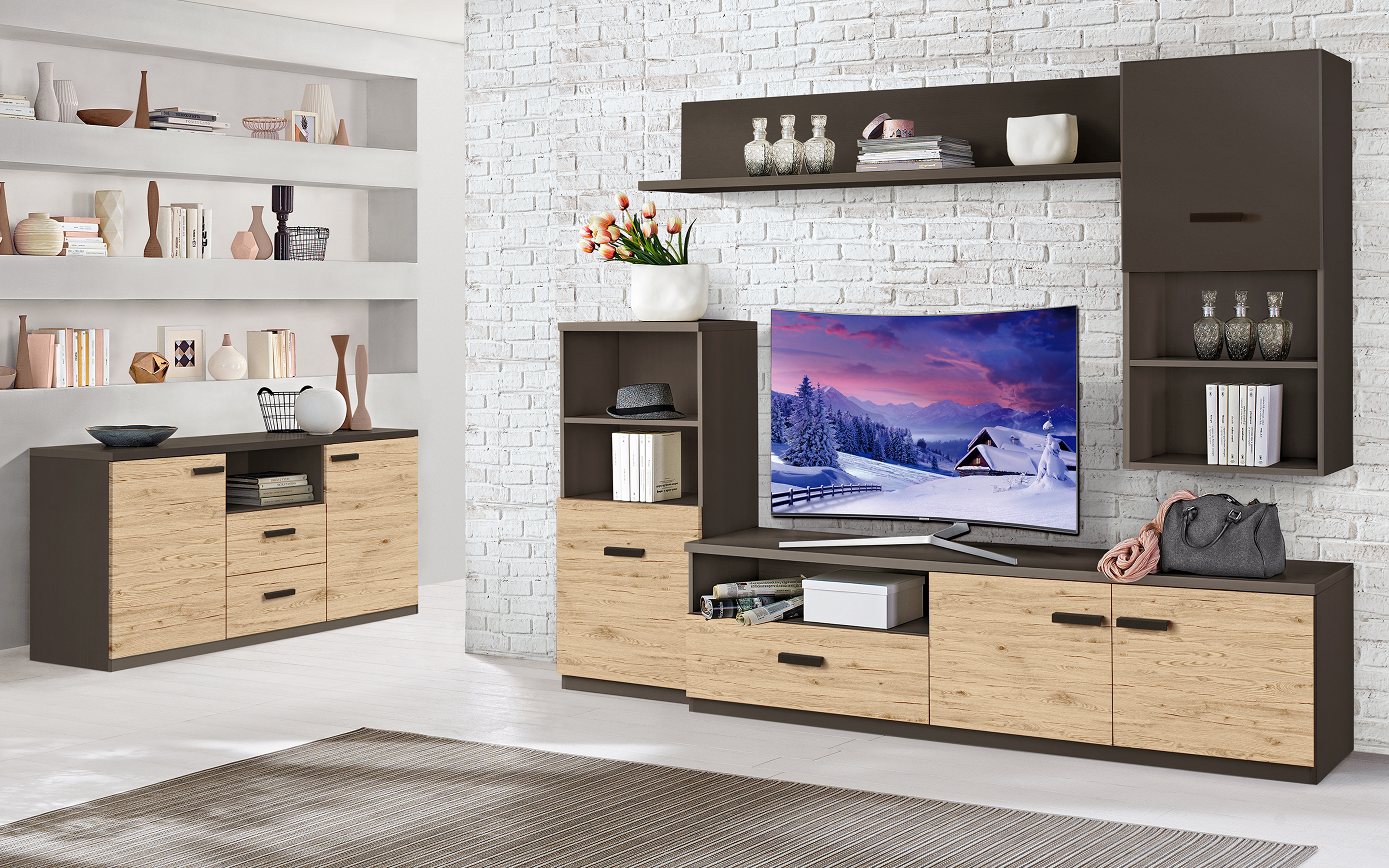 Funzionale combinazione di vani giorno, aperti e chiusi, mensole e cassettoni a chiusura ammortizzata per un soggiorno completo. Lo stile a prezzi imbattibili.
